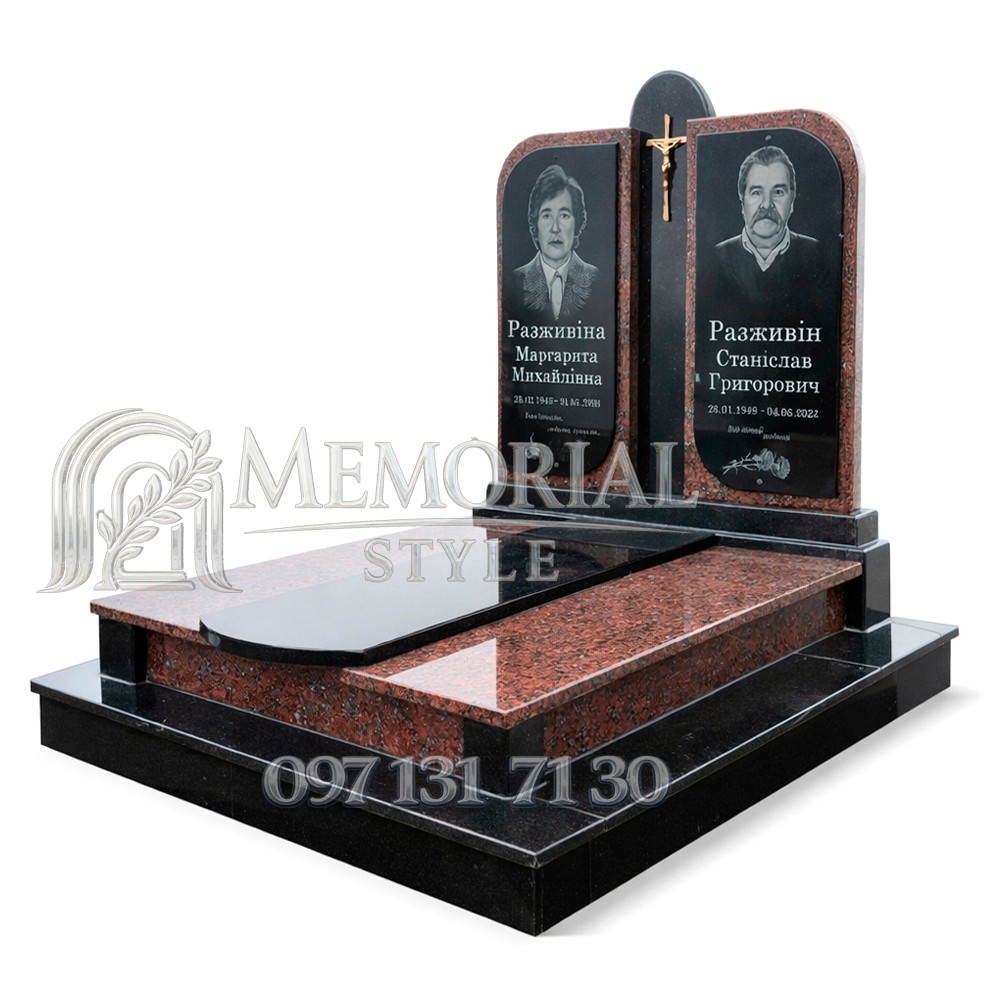Подвійний гранітний пам’ятник з можливістю вибору відкритого або закритого квітника. Орієнтовний термін виготовлення — 8–14 тижнів. За бажанням клієнта надаємо послуги доставки та професійного встановлення.
